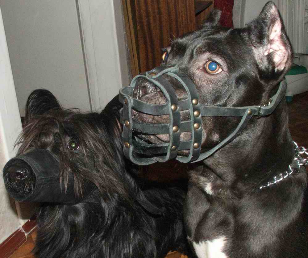 А мне кажется, что если есть проблемы в поведении, то намордник в таком случае бывает необоходим. Ещё его надевают, когда собака *пылесосит*. :) Кстати, для скотчей тоже такие покупают.