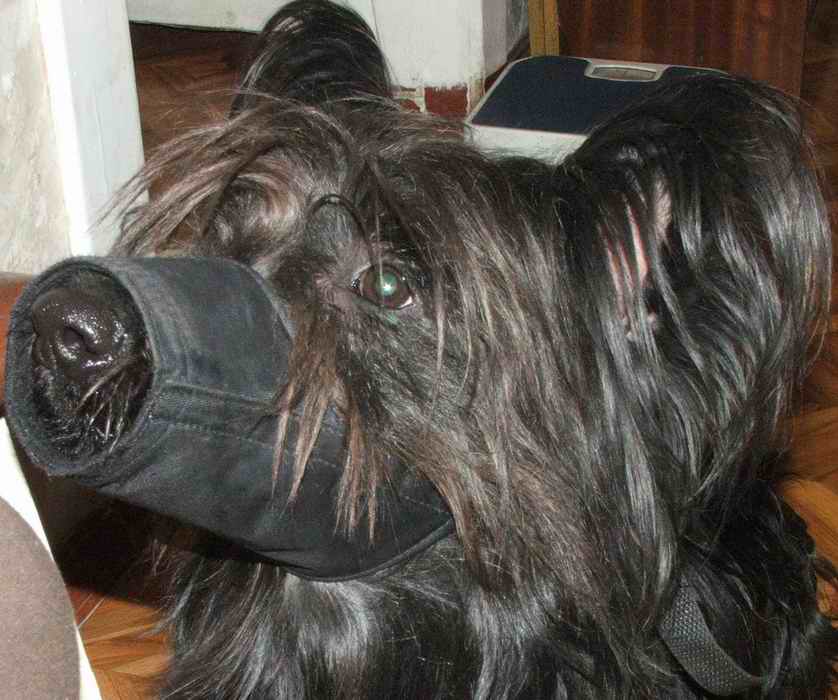 А мне кажется, что если есть проблемы в поведении, то намордник в таком случае бывает необоходим. Ещё его надевают, когда собака *пылесосит*. :) Кстати, для скотчей тоже такие покупают.