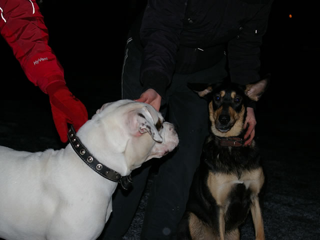 Вот с этой хитрой мордой, что на фото справа от моей Жужки, мы работаем с лета. Когда мы встретились, она с лаем бросалась на все, что движется, а про команды не слышала даже краем уха. Единственное, что ее хоть немного интересовало- мячик. И все... Хозяйку не испугало то, что работать нужно было долго и муторно. Сейчас, по прошествии полугода, мы имеем прилично слушающуюся собаку, которая даже подпускает мою клушу к себе и не пытается откусить ей нос- в первые встречи ближе двух метров к ней было не приблизиться. Хозяйка уже может ее отпустить с поводка и не боится. А месяц назад случилось чудо- собака стала ходить рядом больше, чем два шага! Это было для нас громадное достижение!