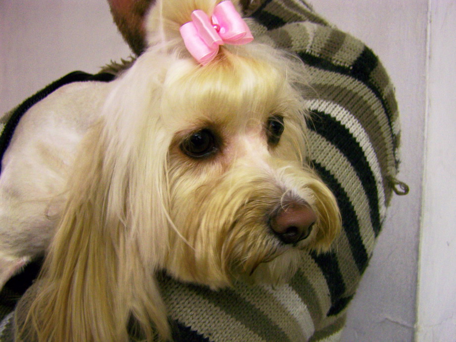 Первый день было забавно, пока Мили не прочухала, что к чему))) Особенно первый момент, когда её вынесли - такую лысую, с развевающимися ушами и бантиком розовым :-X Была радоссная встреча и прыганье до потолка (ещё бы - после перенесённой экзекуции))) Поймали радостные восхищённые взгляды прохожих при выходе из парикмахерской. Ещё бы, когда лает во все стороны блондинистое чудо с модной прычоской и розовым бантиком - это "очень даже мило". А когда лохматый комок шерсти - "уберите собаку!" :-7 Вывод - невоспитанное жывотное обязанно хорошо выглядеть)))